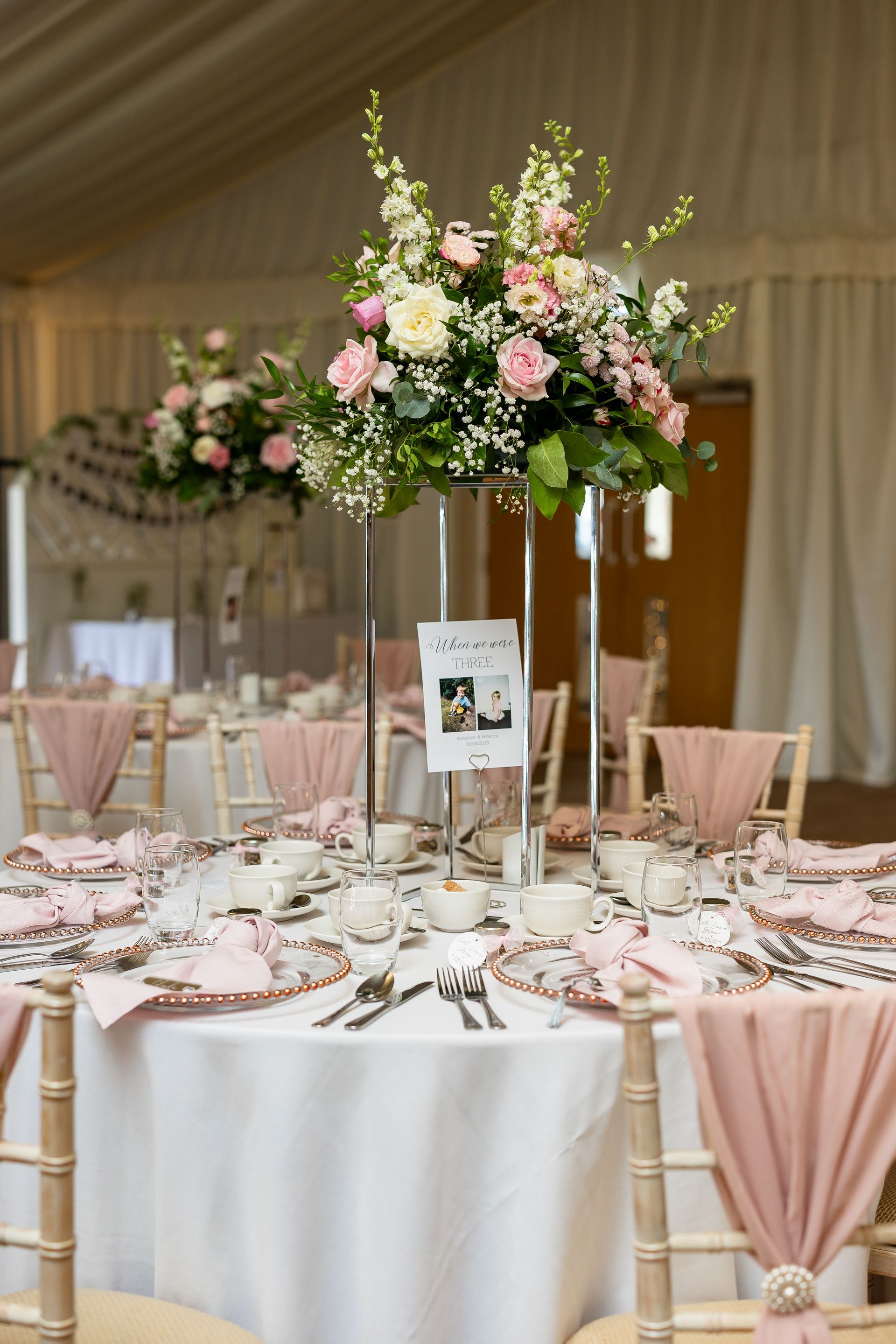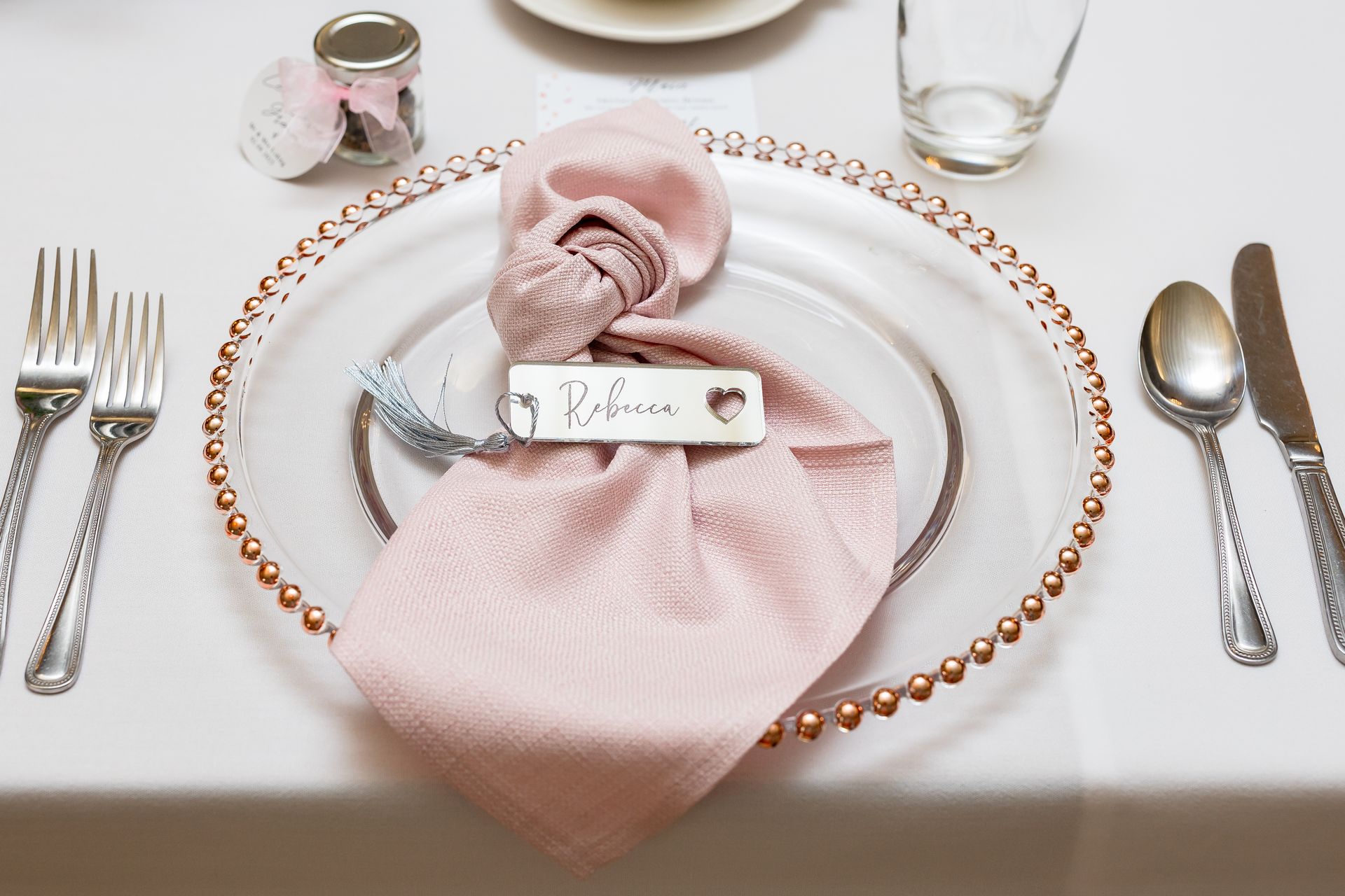 Following a styling session with Wedding and Events Manager Chloe, the couple chose textured napkins, rose gold beaded charger plates and chair drapes fastened with pearl brooches to really make their tables stand out, and by putting it together ahead of their special day, they could picture how it would all come together.